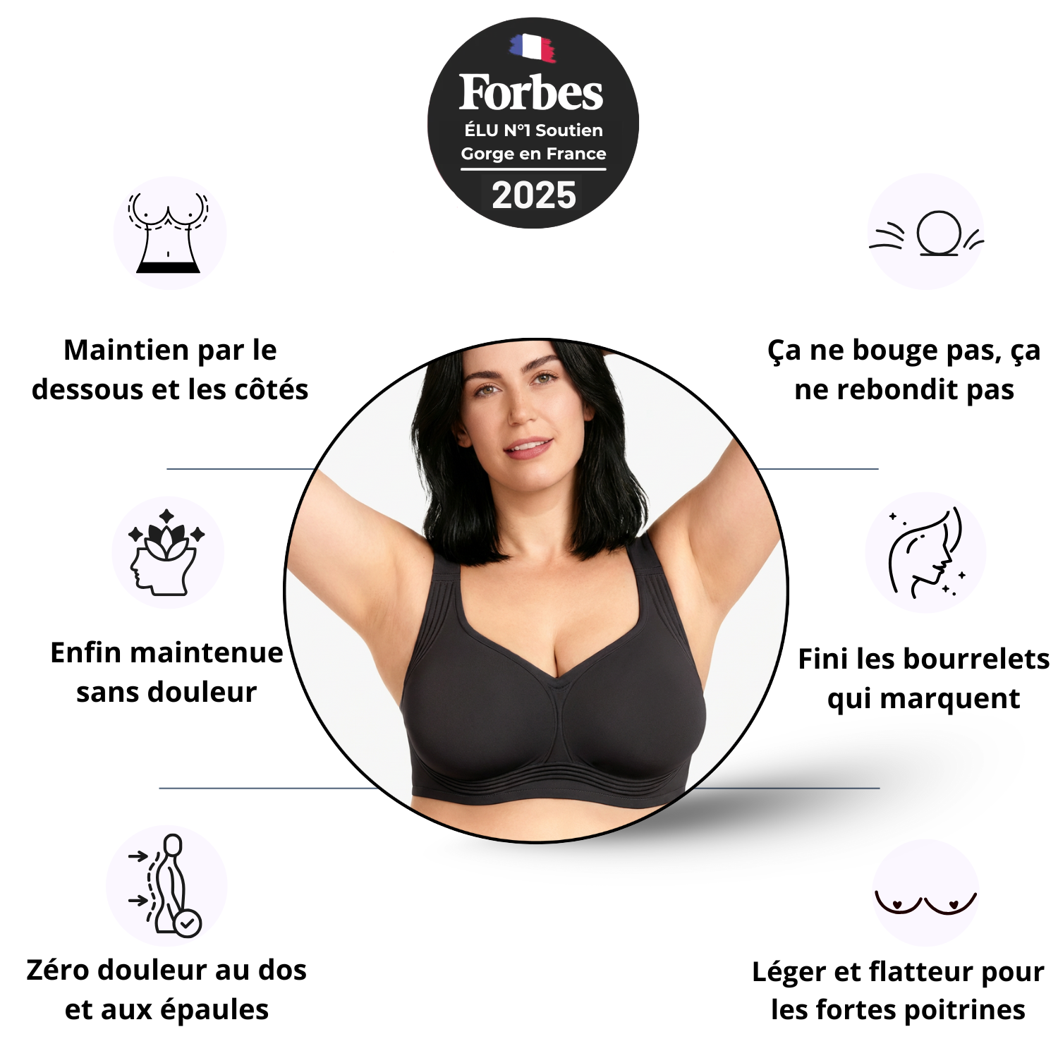 “J’étais très sceptique parce que sans armature, pour moi ça ne tenait jamais. Franchement j’ai été surprise. Ça maintient vraiment, surtout sur les côtés, et sans aucune douleur. Je le garde toute la journée sans y penser.”