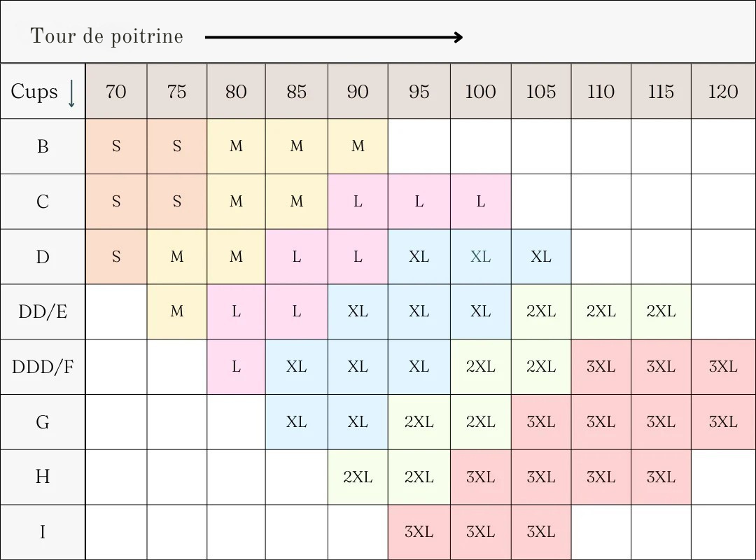 Utilisez notre guide des tailles pour trouver facilement la taille qui vous convient en combinant tour de poitrine et bonnet.